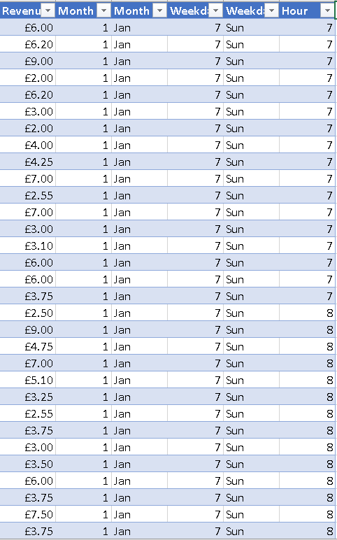 The coffee shop dataset is observed by checking transactions that were recorded over a period of time. Also the number of products and Categories sold was noted. Afterwards a new column was added to calculate Revenue. Additionally the Month, Day of Week and Hours were added.
