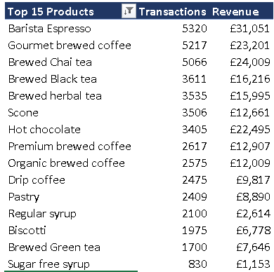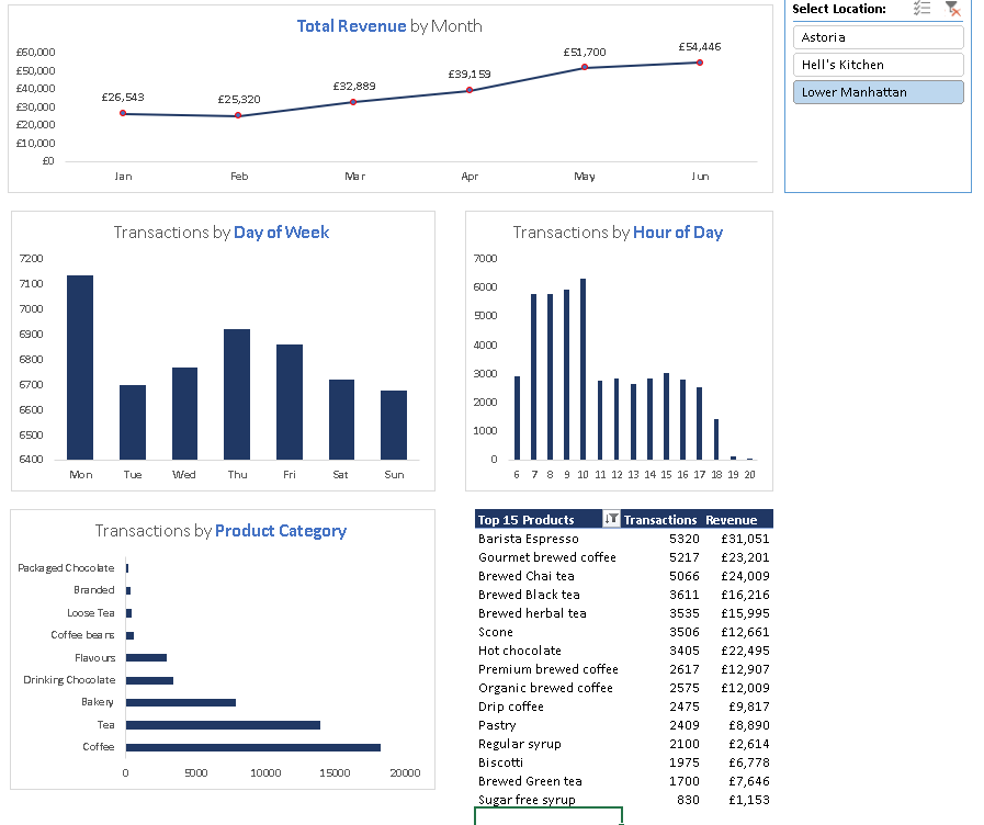 The final step was to create a dashboard to visualize the data. First step was to create Pivot charts to show the Total Revenue by Month, Transactions by Day of the Week, Transactions by Hour of day and Transactions by Product Category. The charts are assembled into a rough dashboard format and contains a table showing the top 15 products types.